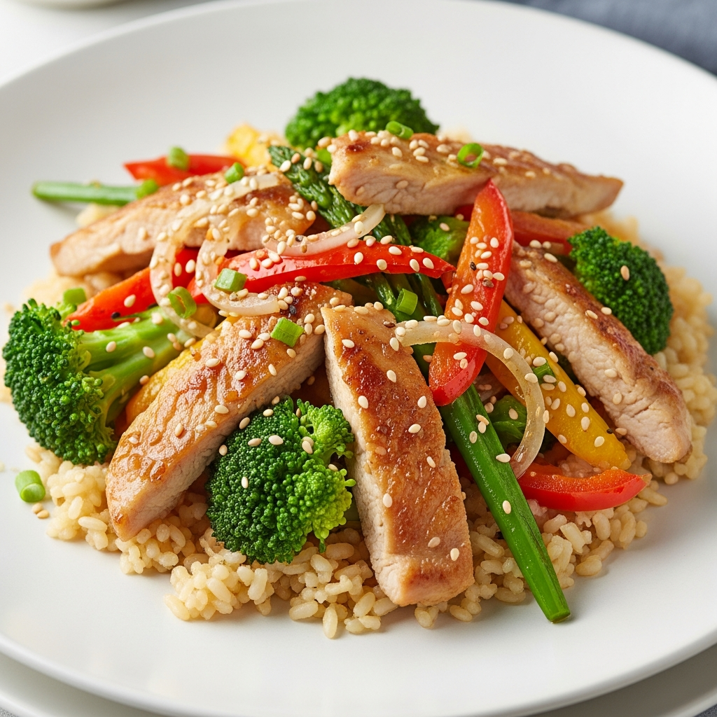 Sirve tu pollo salteado inmediatamente sobre el arroz integral cocido. Si lo deseas, decora con semillas de sésamo y un poco de cebolleta picada para añadir un toque de frescura y sabor extra. ¡Disfruta de una comida completa, sabrosa y muy saludable!