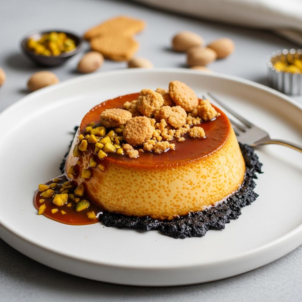 Flan de leche con caramelo de pistacho y crumble de galleta
